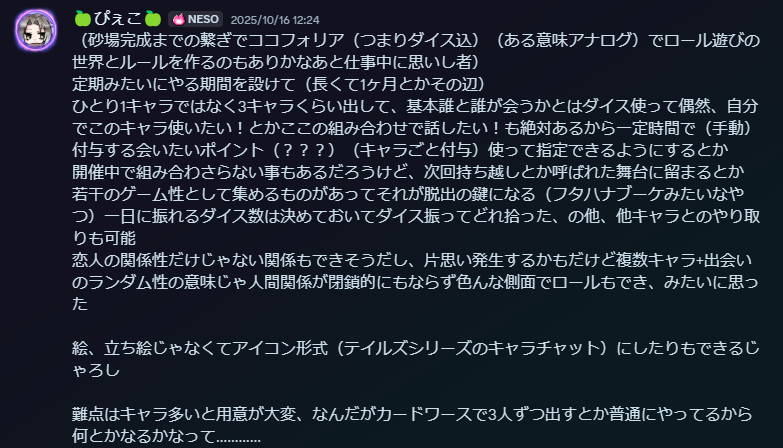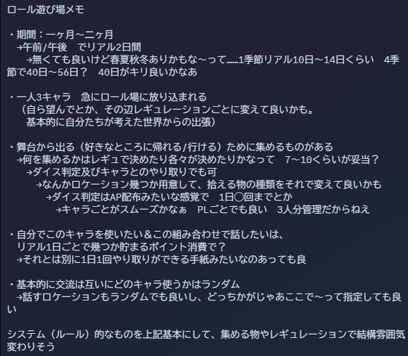なんかこうやって好きにキャラ登録して、開催期間決めてロール遊びしたいよね~ってやつでした。